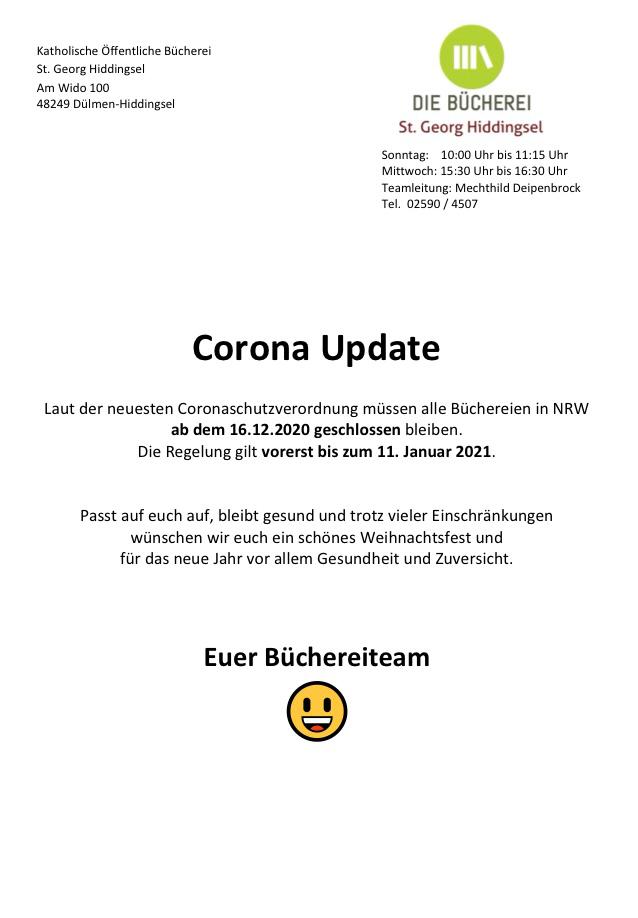 Aufgrund des erneuten Lockdowns muss die Bücherei leider vom 16. Dezember bis zum 11. Januar schließen. Wie es danach weitergeht, erfahren Sie rechtzeitig an dieser Stelle und über Aushänge am Pfarrheim. Die Leihfristen verlängern sich natürlich automatisch.