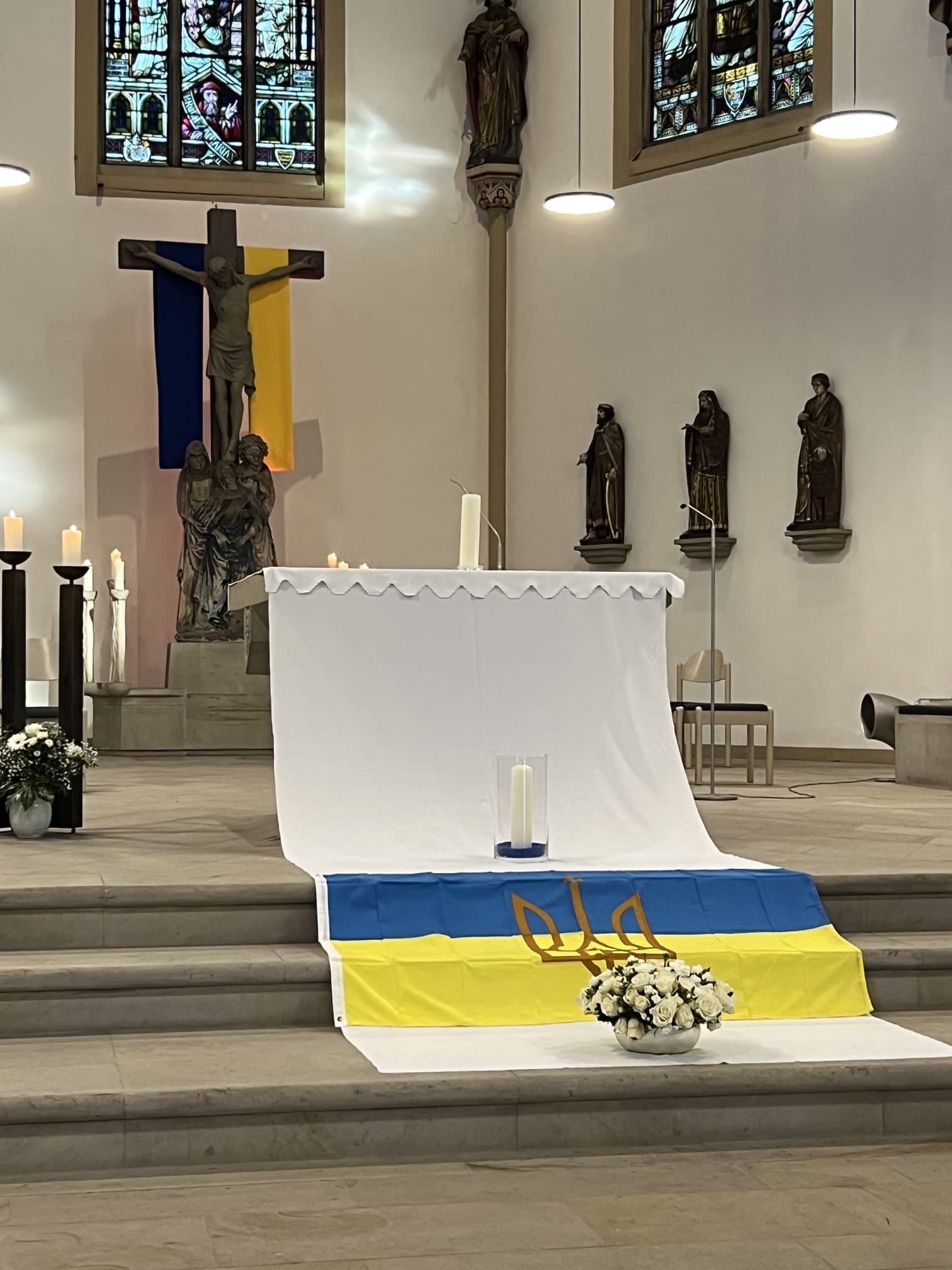 Die Sonntagsgottesdienste am 27. Februar standen in unserer Seelsorgeeinheit ganz im Zeichen des russischen Angriffskrieges gegen die Ukraine. Als sichtbares Zeichen war in beiden Pfarrkirchen eine ukrainische Flagge auf den Stufen vor dem Altar ausgebreitet. Zu Beginn des Gottesdienstes haben wir - begleitet durch Gesang von Kirchenmusikerin Elizabeth Smirnova, Pastoralreferentin Sr. Kitonyi und Pfarrer Ferdinand Hempelmann sowie Gebeten für den Frieden - eine Kerze entzündet.