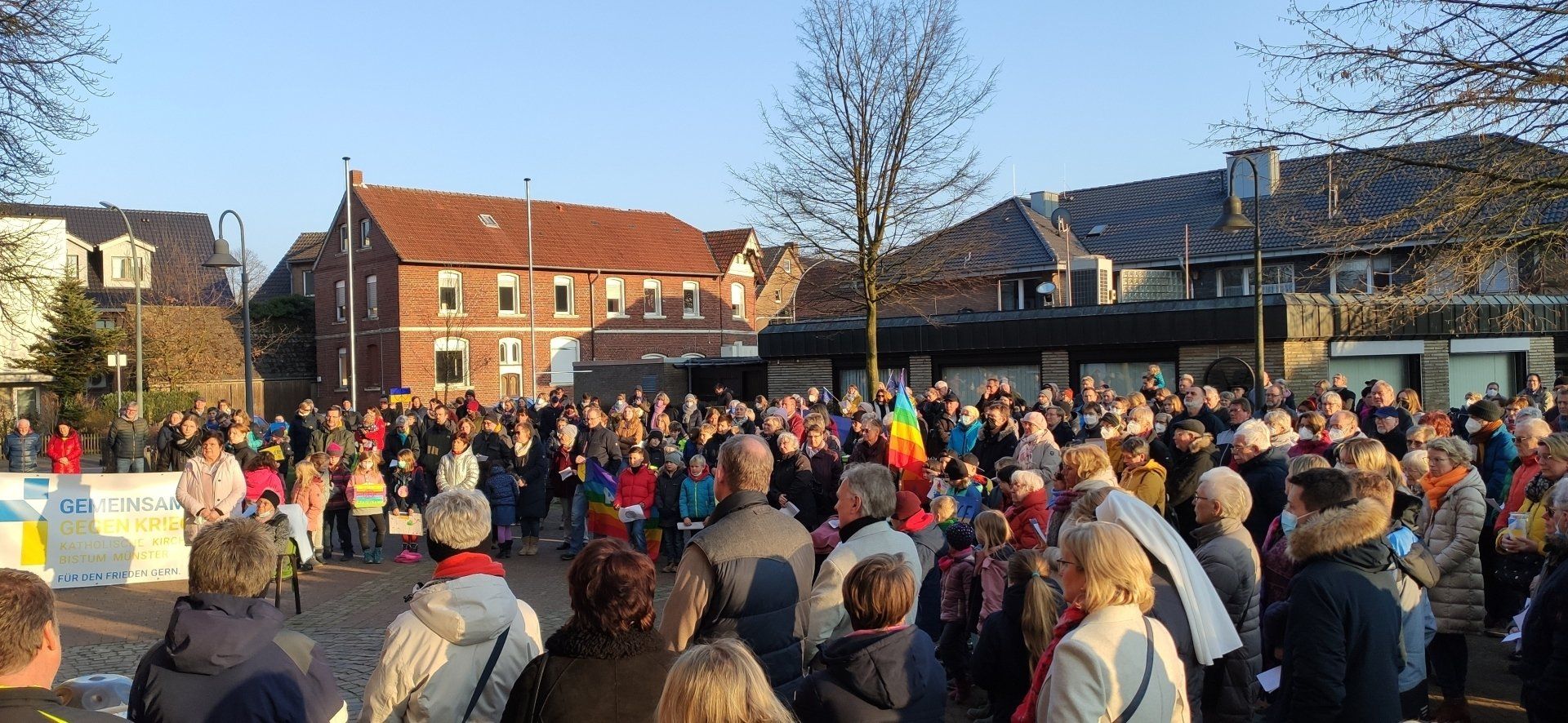 Mehr als 200 Menschen sind unserem Aufruf gefolgt, sich am Samstagnachmittag um 17 Uhr vor der Kirche St. Pankratius in Buldern zu einer Friedenskundgebung zu versammeln. Unter ihnen waren viele Familien mit Kindern. Eine Gruppe von Mädchen hat Muffins und andere Läckerein zum Verkauf angeboten, um mit dem Erlös eine Spendenaktion unterstützen zu können. EIne Familie hatte Kerzen mit der Aufschrift "Friedenslicht" dabei, die gegen eine Spende mitgenommen werden konnten.