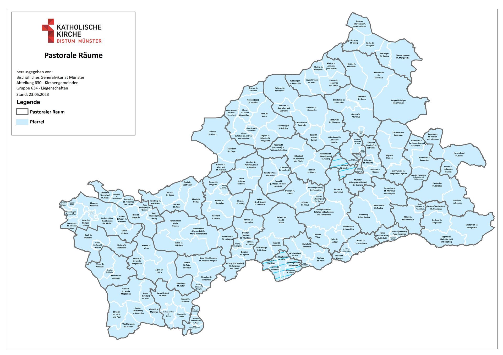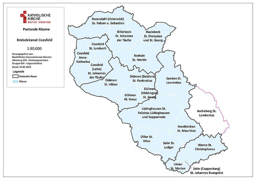 Die 45 Pastoralen Räume im Bistum Münster werden zum 1. Januar 2024 offiziell in Kraft gesetzt. Bischof Genn folgt damit den Rückmeldungen der Pfarreien sowie dem Votum des Diözesanrats. Wie vom Bistum vorgeschlagen und von den Gremien aller betreffenden Pfarreien bestätigt, wird es in Zukunft den Pastoralen Raum Dülmen geben, dem die Pfarreien St. Viktor, Heilig Kreuz, St. Pankratius und St. Georg angehören werden.