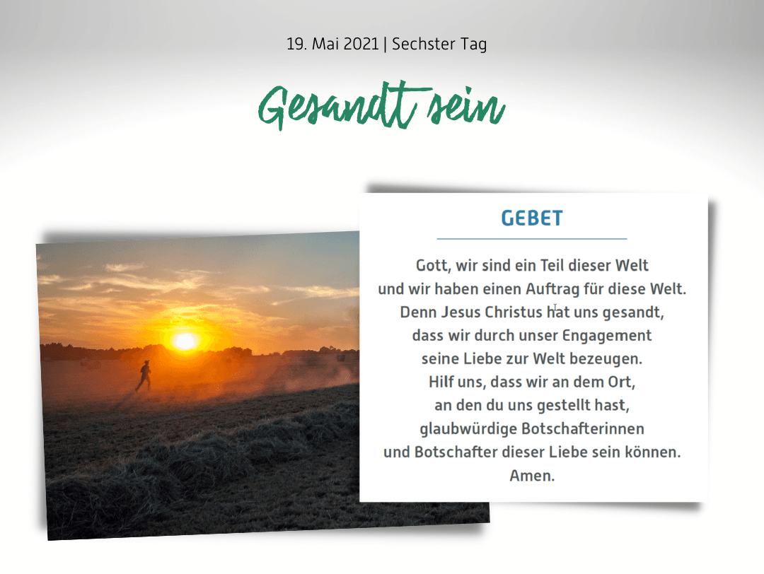 Wir leben in dieser Welt, die in vieler Hinsicht faszinierend schön ist – und zugleich ungerecht, brutal, böse. Aber Jesus sendet die Seinen mitten in diese vielgestaltige Welt hinein. Er kennt sie nur zu gut, denn er wusste sich selbst von seinem Vater in die Welt gesandt. Wenige Stunden vor seinem Tod gibt er diesen Auftrag an alle, die zu ihm gehören wollen, weiter. Nach seiner Auferstehung schenkt er den Heiligen Geist als Impulsgeber für diese Sendung in der Welt von heute. der Ökologie; die Notwendigkeit aufrichtiger und ehrlicher Debatten; die schwere Verantwortung der internationalen
